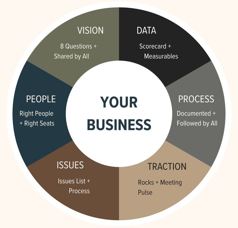 Operational Health (Traction/EOS) My approach leverages the Traction framework to move your organization from friction to flow. We clarify your core values, vision, and structure. We ensure the right people are in the right seats, track key metrics, identifying leverage points, resolve persistent issues, and build the scalable systems your mission requires.